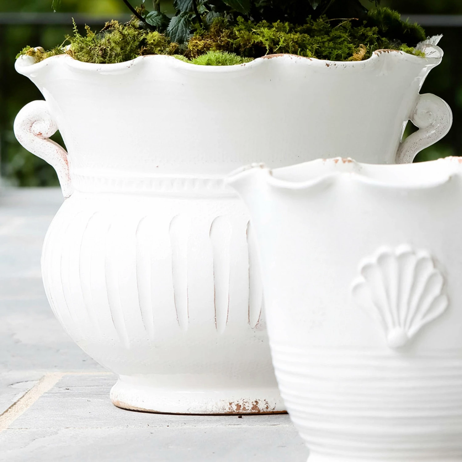 The Rustic Garden White Large Scallop Planter is handsculpted in Italy, and is a beautiful way to bring Italian style into your home through small accents.