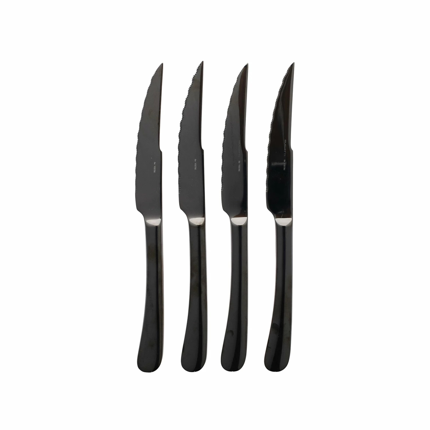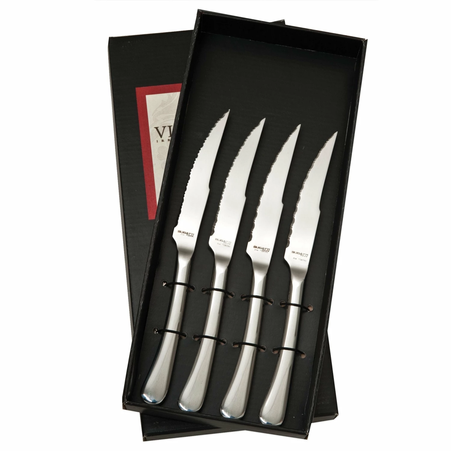 The Settimocielo Boxed Steak Knife Set, with its graceful lines, features a hollow-handled knife that has a forged blade for cutting precision.