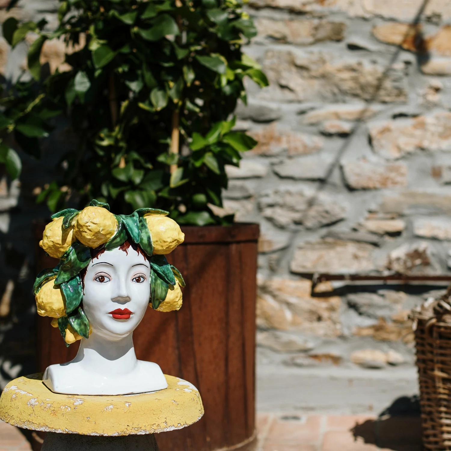 The Sicilian Heads Lemons Head features a beautiful woman with vibrant yellow lemons adorning her head. Sicily has a tradition of displaying female sculptural heads, and they are often used as planters on doorsteps, porches, and balconies.