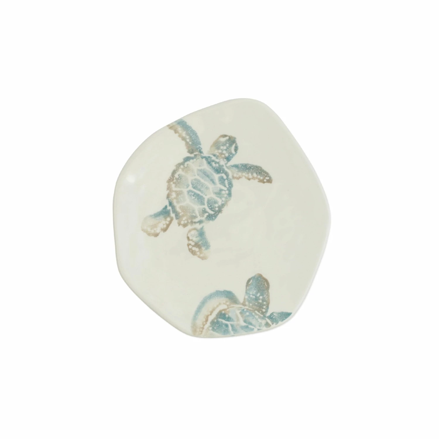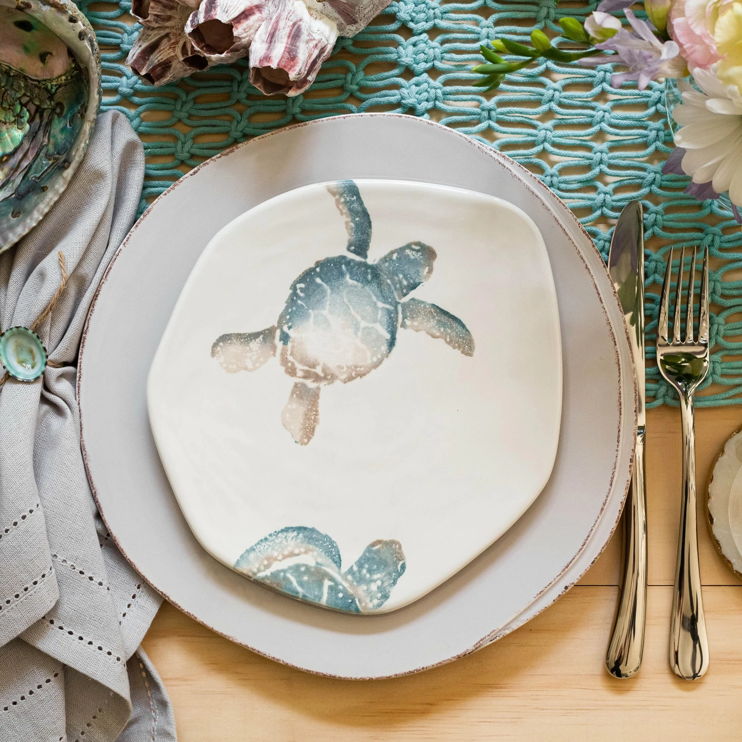 The handpainted sea turtle is rendered in hues of aqua and taupe against a clean, white canvas on the Tartaruga Turtle w/ Head Salad Plate. Maestro artisan, Gianluca Fabbro, utilizes a unique sponging technique to carefully add detail to each piece.