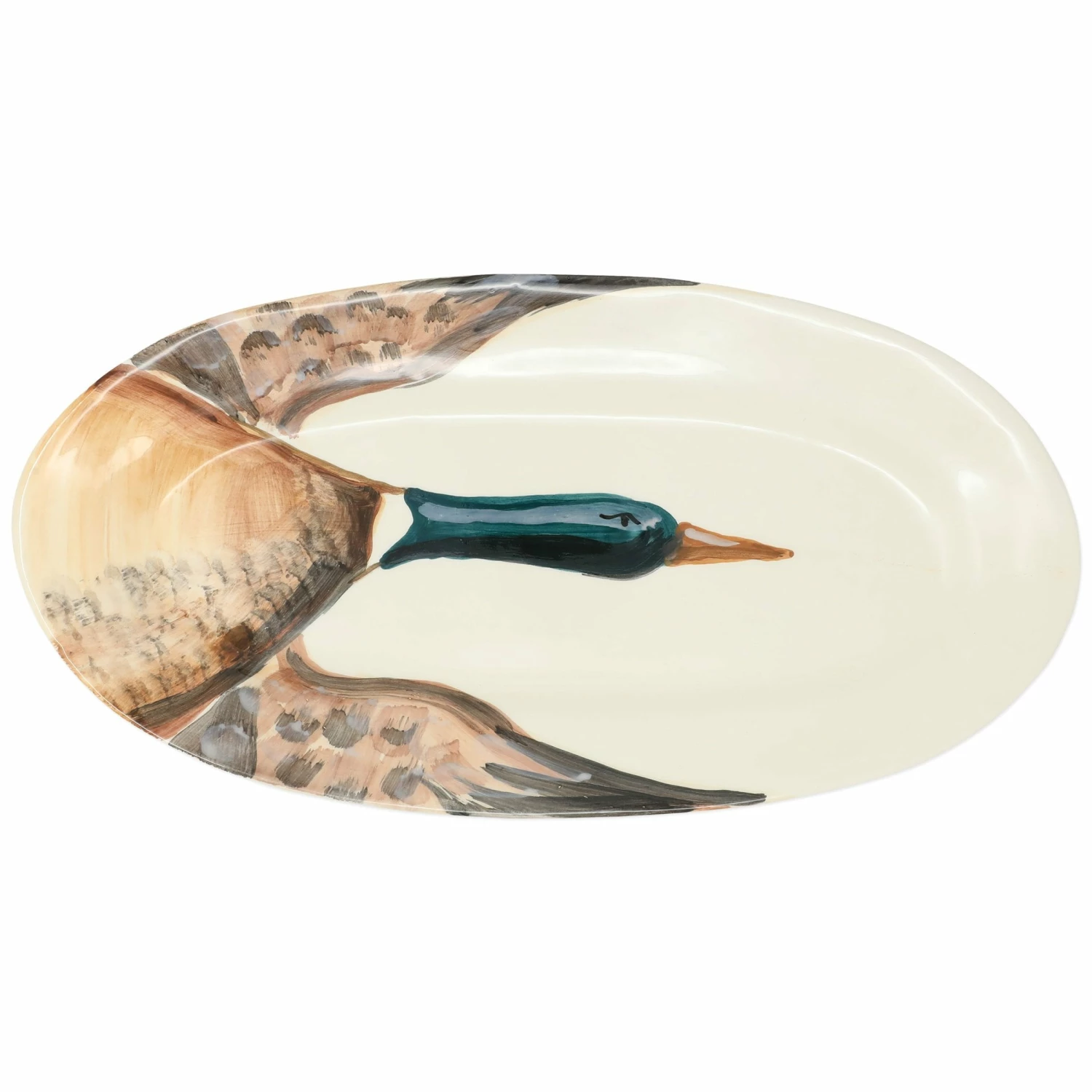 Serve in style at all of your favorite fall festivities with the Wildlife Mallard Narrow Oval Platter. As birds fly south for the winter, this handpainted platter would look lovely hung in your dining room or den.